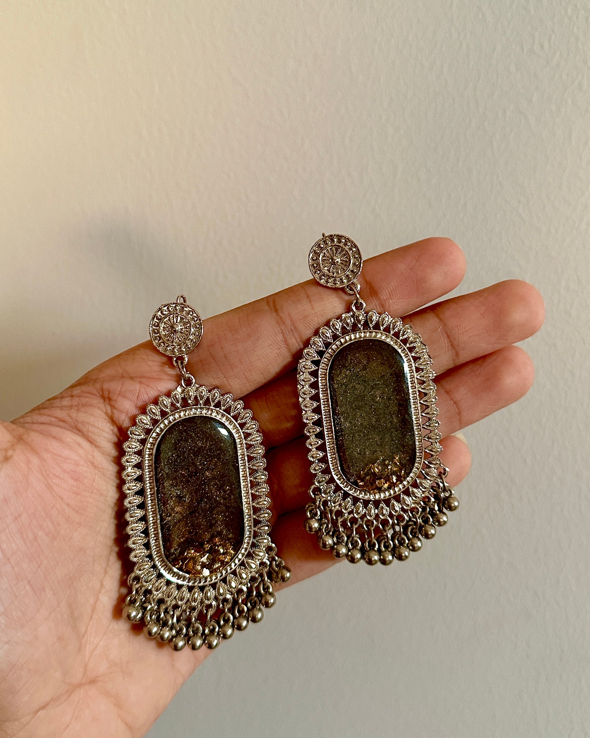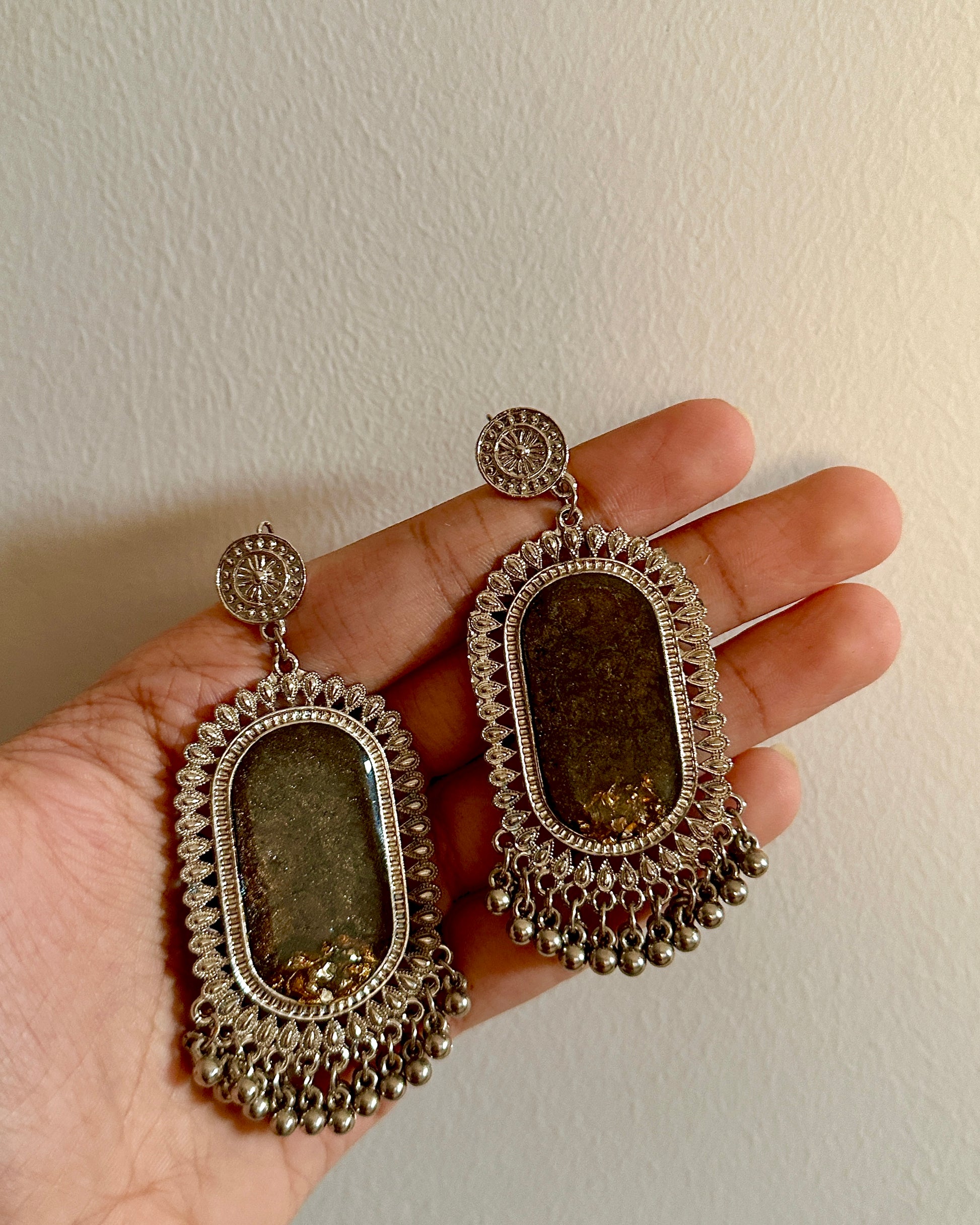 Rukhsaar Jhumkay are handcrafted on a dark mehndia base with gold leaf detailing, preserved in refined resin to keep their beauty timeless.